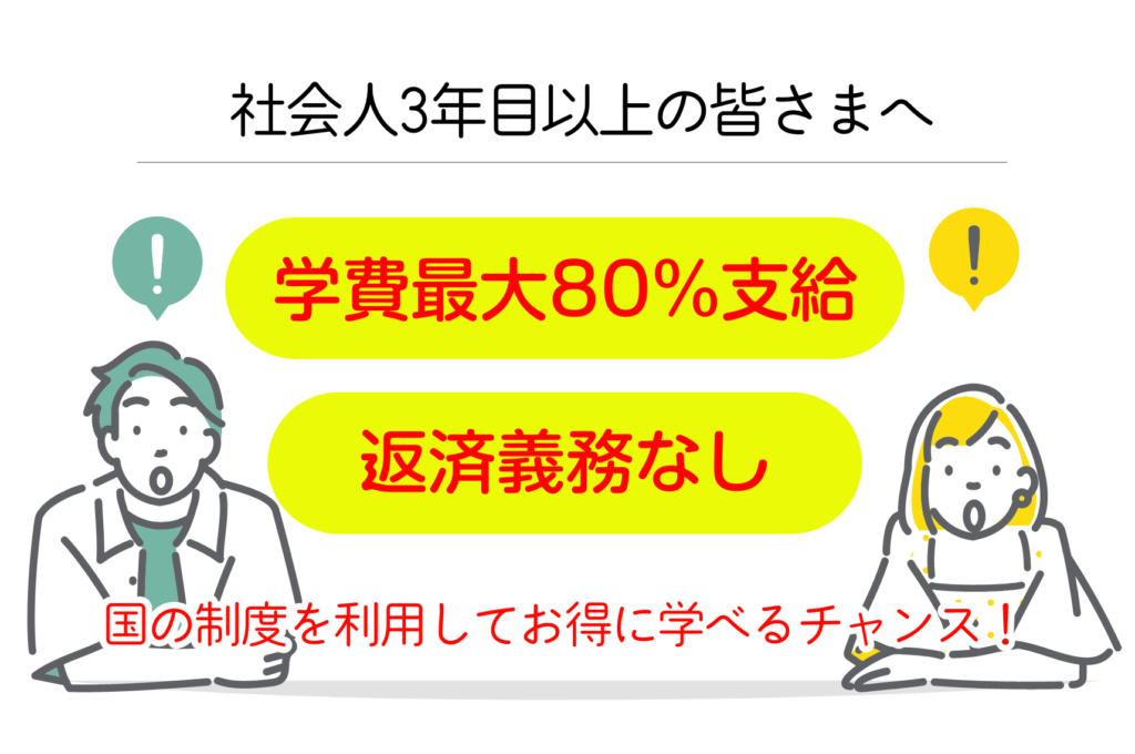 教育訓練経費(入学金と授業料)の50%(年間上限40万円)がハローワークから最大3年間支給され、さらに卒業後1年以内に資格を取得し、雇用保険に新たに加入または継続加入している場合、教育訓練経費の20%の額が追加支給されます。