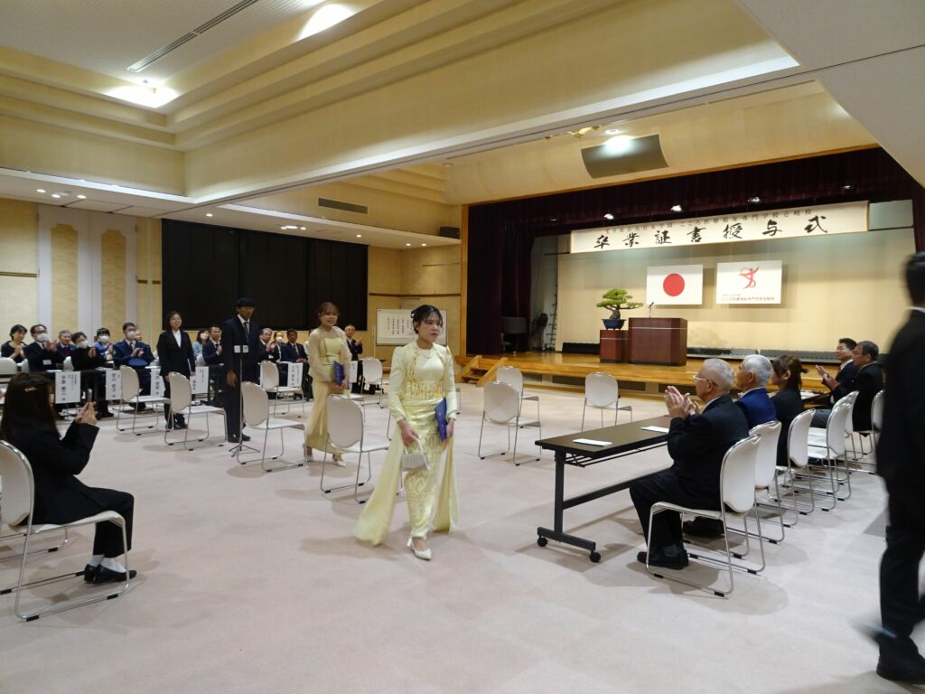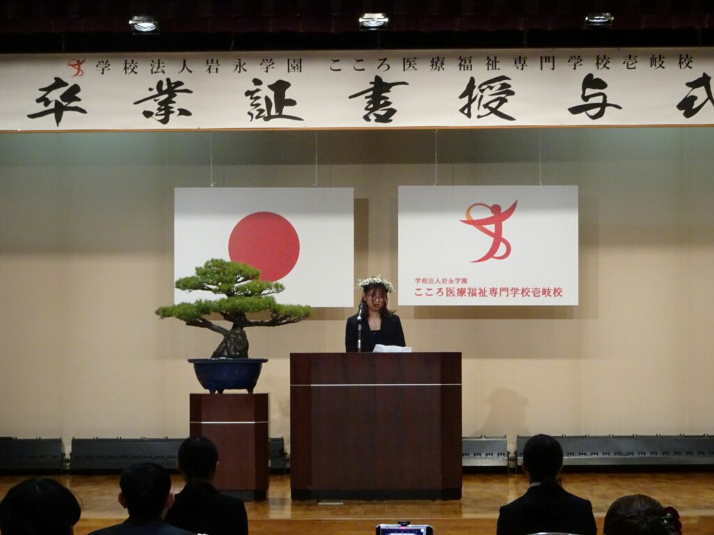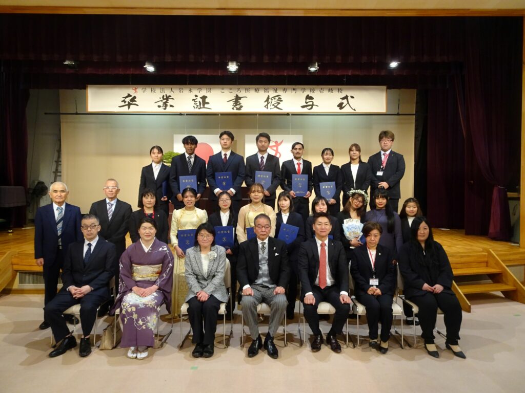 令和7年度 卒業証書授与式を挙行いたしました 投稿日 2026年3月5日 著者 iki_admin カテゴリー Uncategorized 本日3月5日、壱岐校において令和7年度 第8回卒業証書授与式をたくさんのご来賓・保護者のご臨席のもと挙行いたしました。 本年度は日本人学生5名、留学生7名の計12名が、晴れて卒業の日を迎えました。 壱岐の地で共に学び、切磋琢磨しながら共に学んだ日々を胸に、12名の卒業生が新たな門出に立ちます。4月から始まる自分たちが選んだ新しい道での、今後のさらなる飛躍とご多幸を祈っています。