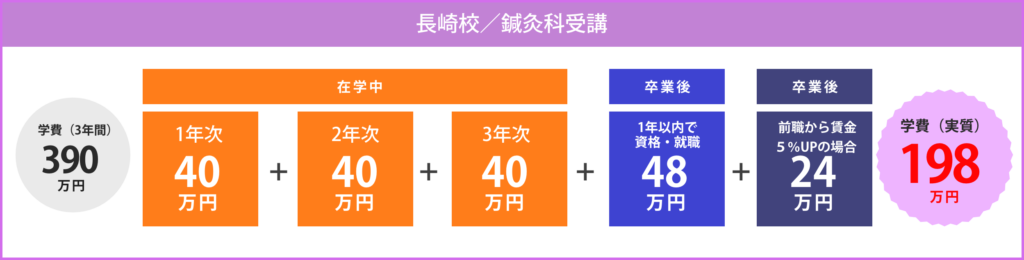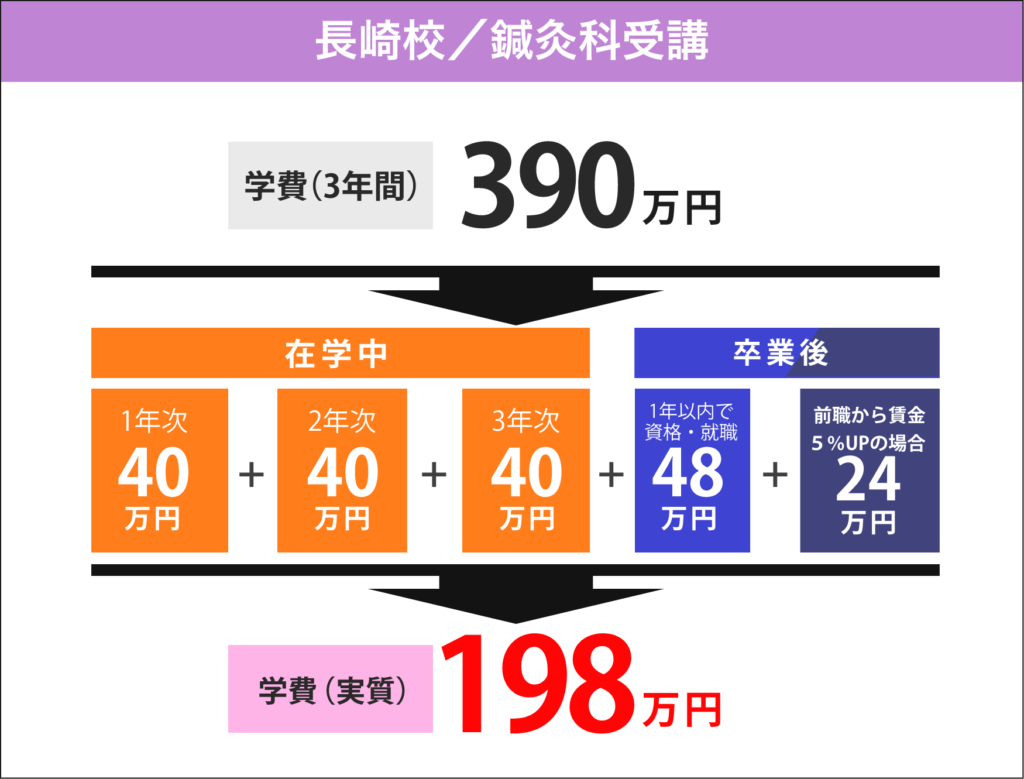 本校の「鍼灸科(長崎校)」は、働く人の主体的で中長期的なキャリアアップの支援を目的とする給付金制度「専門実践教育訓練給付金」の対象講座として、厚生労働省より指定を受けています。今まで、経済的な理由で進学を断念していた社会人の皆さん、専門実践教育訓練給付制度を利用して、夢の治療家への転身を目指しませんか?