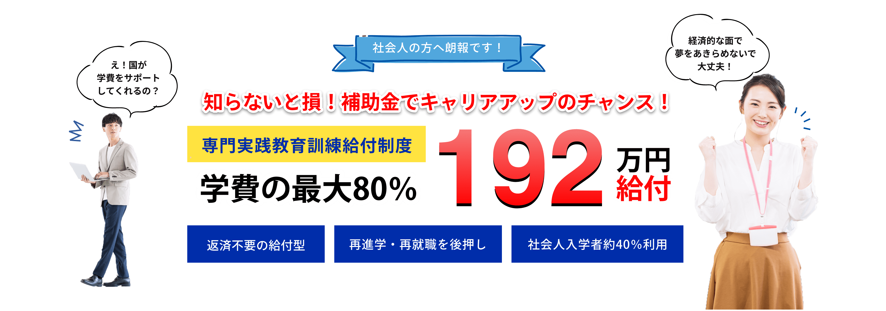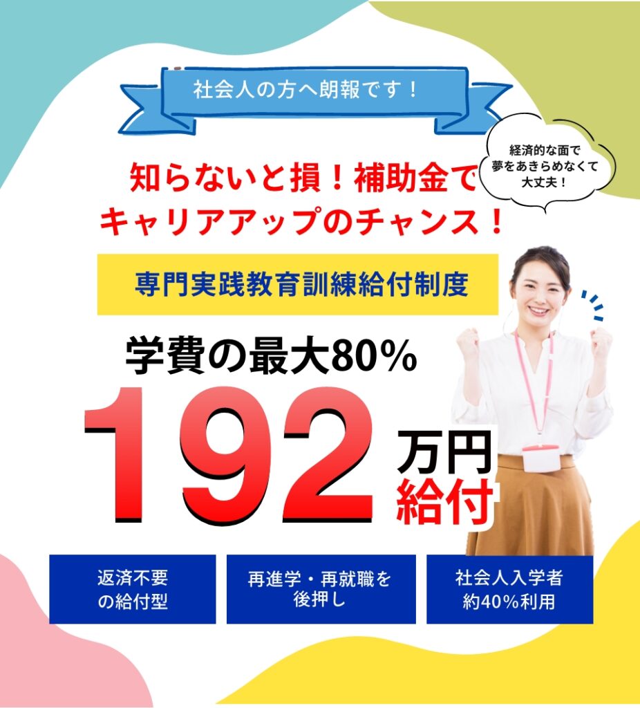 専門実践教育訓練給付講座を受講すると教育訓練費の50%(年間上限40万円×3年)が給付されます。