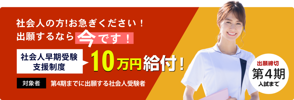 今なら社会人の方、早期受験支援制度により10万円給付!2023年1月16日(火)までの出願者に限ります。