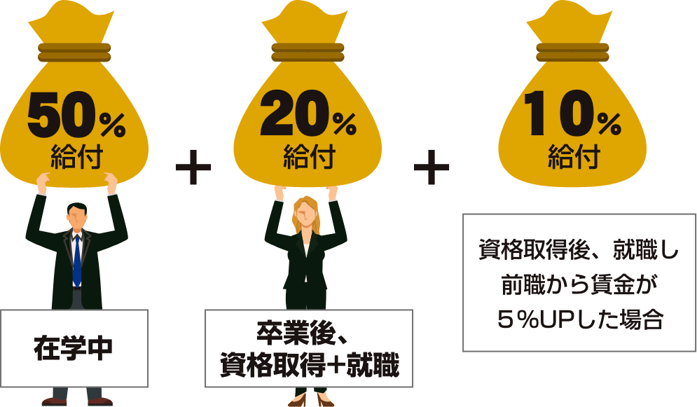 教育訓練経費(入学金と授業料)の50%(年間上限40万円)がハローワークから最大3年間支給されます!さらに、卒業後1年以内に資格を取得し、雇用保険に新たに加入又は継続加入すると、教育訓練経費の20%の額が追加支給されます。
